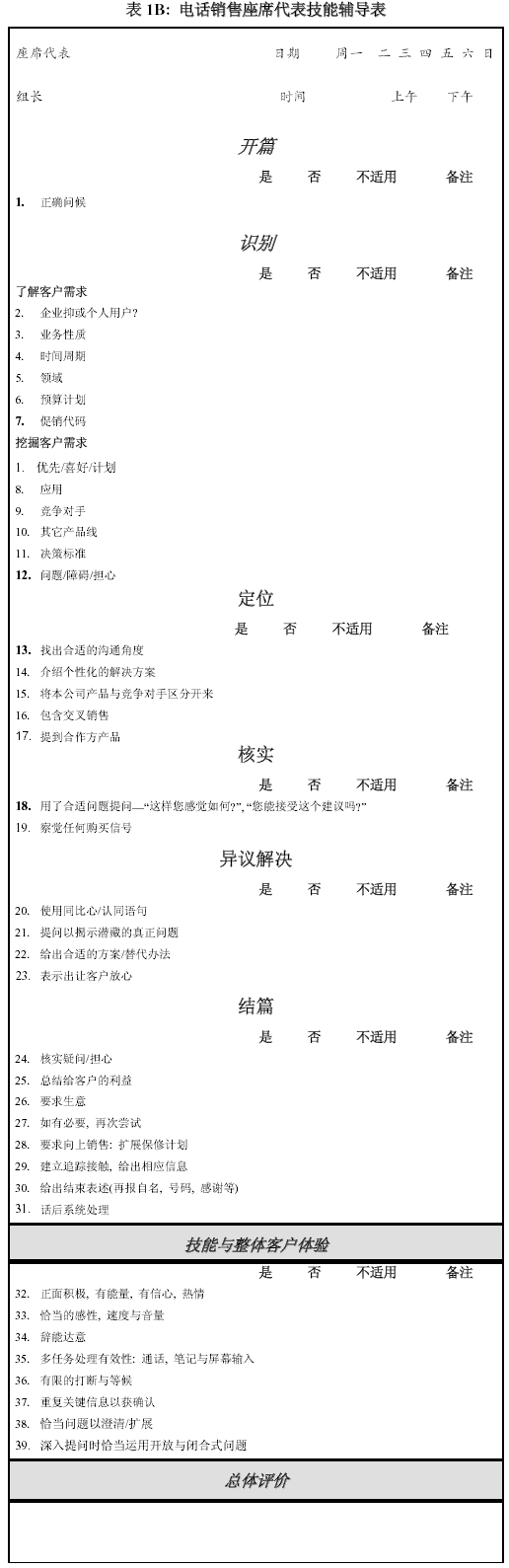 。。以上的表格主要是給從事客戶服務(wù)的座席代表使用,以下的表格是根據(jù)我自己使用過的對具電話營銷功能的座席代表輔導(dǎo)表改動(dòng)而來。
