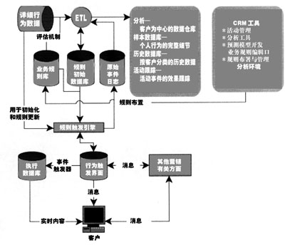 關(guān)系數(shù)據(jù)庫系統(tǒng)有三種主要數(shù)據(jù):典型客戶案例的詳細數(shù)據(jù)、對所有客戶的總結(jié)性歷史數(shù)據(jù)以及具體活動的數(shù)據(jù)。分析數(shù)據(jù)庫提供輸入數(shù)據(jù),從而得到對客戶的認(rèn)識,而滿足ETL處理的業(yè)務(wù)規(guī)則庫為分析數(shù)據(jù)庫提供派生屬性。這個過程將保持離線分析和實時事件觸發(fā)規(guī)則之間的同步,在動態(tài)建立表格的過程中處理初始化完成后的派生屬性相加,并對相應(yīng)的元數(shù)據(jù)進行更新,這些處理都是自動實現(xiàn)的。
