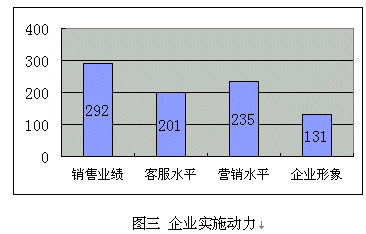 (d)提升企業(yè)形象:很多受訪企業(yè)特別是服務(wù)業(yè),已經(jīng)建立客戶忠誠度放在了很重要的位置,但比較其它幾個(gè)直接動(dòng)因,比例偏低,這也似乎說明"以客戶為中心"的觀念還沒有"以利潤為中心"強(qiáng)烈。