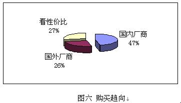鑒于國內(nèi)并沒有知名度很高的CRM實(shí)施廠商,而國外的著名廠商在國內(nèi)的品牌宣傳也不足,所以調(diào)查表中只設(shè)了:國內(nèi)廠商、國外廠商和根據(jù)性價(jià)比進(jìn)行選擇三個(gè)項(xiàng)目,與購買能力對照,預(yù)期實(shí)施金額在100萬以下的企業(yè),一般側(cè)重國內(nèi)廠商,而實(shí)施金額在100萬以上企業(yè)則側(cè)重國外企業(yè)。