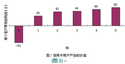 以信用卡服務(wù)為例,爭取一個(gè)新的用戶平均要51美圓,用于廣告、推銷和開戶等開支。用戶開始時(shí)花錢很少,但為公司帶來一定的利潤。但如果用戶繼續(xù)使用到第二年,就會(huì)為公司帶來更多的經(jīng)濟(jì)效益,因?yàn)楣九c客戶之間的信任和客戶對公司的滿意,致使客戶更多地通過信用卡消費(fèi)。(圖:"信用卡用戶產(chǎn)生的價(jià)值")用戶貢獻(xiàn)在增加,公司的運(yùn)作費(fèi)用卻在不斷減低。信用卡公司可以不斷減少對客戶信用的審核時(shí)間。保持長期的客戶關(guān)系,還可以減少廣告支出,客戶本身就是一個(gè)免費(fèi)的廣告資源。很多人在消費(fèi)前喜歡聽取朋友的意見,覺得比廣告更可信。