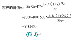 假設(shè)客戶與公司保持交易時(shí)間:N=5年;公司最初吸引每個(gè)客戶的成本(營銷費(fèi)用): C0=¥400;客戶第一次購買的產(chǎn)品價(jià)格:P0=¥2000;公司期望每年從每個(gè)客戶處增加的收入:R=¥500;利率(一般指貸款利率): r =9%;那么客戶的價(jià)值等于:客戶初次購買產(chǎn)品和以后幾年每年消費(fèi)價(jià)值的折現(xiàn)之和,減營銷成本,即: