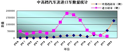第三階段:1999年以后的快速增長(zhǎng)階段。1999年中高檔汽車產(chǎn)銷量結(jié)束了六年的徘徊局面,首次突破5萬輛,比上年增長(zhǎng)了1.5倍,在轎車市場(chǎng)中的占有率升到9.7%。2000年中高檔汽車的產(chǎn)量又實(shí)現(xiàn)翻倍,增長(zhǎng)率為232.46%,年產(chǎn)量達(dá)到127,676臺(tái)。進(jìn)口中高檔汽車數(shù)量也超過了3萬臺(tái),僅日本車的進(jìn)口量就達(dá)23,502臺(tái)。