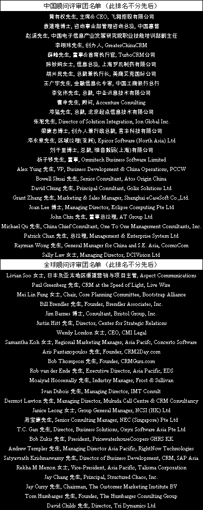 五、 權(quán)威性。GreaterChinaCRM邀請(qǐng)?jiān)摍C(jī)構(gòu)50多位(包括中國(guó)和外國(guó))最權(quán)威的CRM專(zhuān)家擔(dān)當(dāng)此次評(píng)選的評(píng)審團(tuán)。