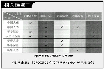 據(jù)某IT媒體2002年末的調(diào)研,只有不到1/5的中國保險(xiǎn)公司擁有客戶關(guān)系管理系統(tǒng),但是近六成的保險(xiǎn)公司計(jì)劃在近期內(nèi)實(shí)施CRM;另一份調(diào)查則顯示中國保險(xiǎn)業(yè)過去3年的IT投入平均達(dá)到9.36億元,幾乎所有的保險(xiǎn)公司都在從不同側(cè)面開展CRM建設(shè)。CRM在中國保險(xiǎn)業(yè)的應(yīng)用,到底是處于落伍還是冒進(jìn)狀態(tài),成為一個(gè)意味深長的話題。