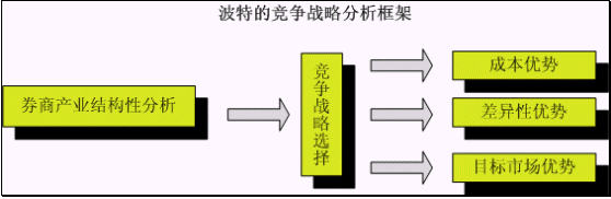 上圖為利用哈佛著名教授邁克爾o波特的競爭戰(zhàn)略分析框架來分析證券營業(yè)部的競爭戰(zhàn)略。由于此文的著眼點是以證券營業(yè)部為中心的產(chǎn)業(yè),也就是證券公司的經(jīng)紀(jì)業(yè)務(wù)產(chǎn)業(yè),而證券公司的其他金融服務(wù)項目如投資、自營等業(yè)務(wù)不在本文討論的范疇。