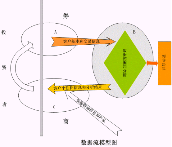 如數(shù)據(jù)流和服務模型圖所示,B模塊就是對客戶進行數(shù)據(jù)分析和數(shù)據(jù)挖掘的模塊。這個模塊將會對領導決定支持和為下一步真正的為核心客戶提供更有針對行的服務提供基礎。