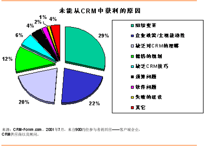 但成功只會(huì)擁抱那些能夠“正確執(zhí)行”的人,而不是任何一個(gè)搭上CRM順風(fēng)船的企業(yè)。2001年7月,CRM-Forum.com出版了一份關(guān)于未能從CRM中獲利原因的報(bào)告。從搜集到的來(lái)自CRM開(kāi)拓者的約900個(gè)回應(yīng)來(lái)看——客戶(hù)端企業(yè),CRM供應(yīng)商以及顧問(wèn),組織變革及企業(yè)政策/主觀(guān)能動(dòng)性占了50%以上的失敗原因;緊隨其后的各個(gè)因素包括缺乏對(duì)CRM的理解(20%)和糟糕的規(guī)劃(12%)。下面讓我們就CRM方法論的選擇對(duì)這些因素作一番考察吧。