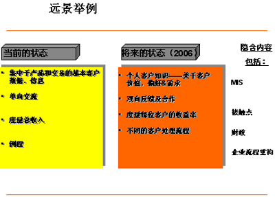 在評(píng)估當(dāng)前情況與遠(yuǎn)景,資源需求,癥結(jié),極限以及鋪就路標(biāo)和里程碑的關(guān)系時(shí),實(shí)施展望和差距分析會(huì)議是十分重要的。取決于你對(duì)CRM遠(yuǎn)景的定義——無(wú)論是它將成為一個(gè)能夠給你一把競(jìng)爭(zhēng)利刃的企業(yè)策略 (類(lèi)似的例子有Citicorp,Dell,F(xiàn)ord Motors) 或僅僅只是一個(gè)讓你更出眾的營(yíng)銷(xiāo)項(xiàng)目——這邁出的第一步在你選擇CRM方法論的過(guò)程中都必將起到舉足輕重的作用。一個(gè)核心的方法論必須能夠支持企業(yè)大部分的業(yè)務(wù)和流程需求,如MIS;客戶(hù)體驗(yàn)管理;接觸點(diǎn)管理;收益率管理等等。