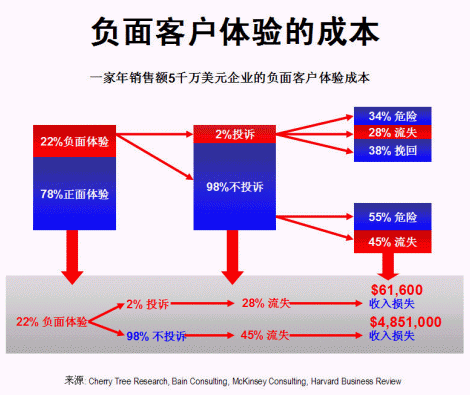 一家年銷售額五千萬美元的企業(yè),假設(shè)正面客戶體驗(yàn)為78%,負(fù)面體驗(yàn)為22%,在所有負(fù)面體驗(yàn)中,只有2%的客戶投訴,其余98%大多數(shù)均不投訴,保持沉默(這與現(xiàn)實(shí)情況頗為吻合)。在2%投訴客戶中,有34%經(jīng)過處理仍然未能令客戶完全滿意,尚有流失的危險;28%的客戶在處理后依然流失,余下38%的客戶則感到滿意,繼續(xù)留下。對大部分(98%)沒有投訴的客戶,因公司對他們的不滿意并不知情,所以沒有采取行動,55%的客戶有隨時流失的危險,其余45%已經(jīng)流失。