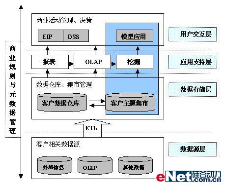 從上面的分析型CRM體系結(jié)構(gòu)圖可以看出,整個架構(gòu)分為數(shù)據(jù)源層、數(shù)據(jù)存儲層、應(yīng)用支持層和用戶交互層總共四層。數(shù)據(jù)源層包括了企業(yè)常用信息系統(tǒng)和一些外部系統(tǒng)的數(shù)據(jù)源,比如涉及到客戶交互的一些交易系統(tǒng),服務(wù)系統(tǒng),各系統(tǒng)間的客戶數(shù)據(jù)是分散的,而且可能重合,出現(xiàn)不一致的問題;數(shù)據(jù)存儲層是為了整個企業(yè)有集中統(tǒng)一的客戶視圖,通過從各源系統(tǒng)抽取數(shù)據(jù),進行整合后的數(shù)據(jù)倉庫,而且在客戶數(shù)據(jù)倉庫的基礎(chǔ)上,可以建立相關(guān)分析之用的客戶主題數(shù)據(jù)集市;應(yīng)用支持層除了支持復(fù)雜,智能化報表查詢外,還支持OLAP分析,提供數(shù)據(jù)挖掘功能;用戶交互層提供分析和挖掘結(jié)果同企業(yè)管理、決策層和企業(yè)其它服務(wù)人員和客戶的交互,形成反饋機制,從而有效地利用分析和挖掘得到的有用知識。