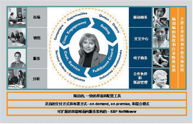 mySAP CRM不僅包含了企業(yè)市場營銷、銷售、服務、分析等功能,還通過渠道伙伴、現(xiàn)場和移動商務、交互中心、電子商務等各種交互渠道形成完整的閉環(huán)式設計的解決方案。在提供深入的行業(yè)應用和傳統(tǒng)的部署方式的同時,mySAP