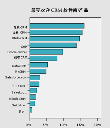 而在此類調(diào)查中一直名列前茅的國外CRM軟件商三巨頭SAP和 Oracle-Siebel(由于Siebel已被Oracle兼并,現(xiàn)以Oracle-Siebel代替),在本次知名度調(diào)查中則落后于以上三家CRM軟件商。SAP和Oracle-Siebel的這一比例分別為13.80%和9.74%。