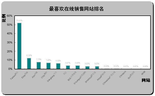 在選擇易趣中國(guó)作為最不喜歡在線銷售網(wǎng)站的被調(diào)查者原因中,很大一部分被調(diào)查者認(rèn)為易趣中國(guó)操作不便利,網(wǎng)頁(yè)設(shè)計(jì)不友好,而且東西種類有限。另外,很多用戶對(duì)易趣的安全性和信任度也頗有微詞。