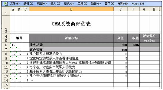 根據(jù)評估分?jǐn)?shù)值形成CMM評估表,為電子表格形式,帶有指標(biāo)編號和權(quán)重、分值,后面為實(shí)際評測分?jǐn)?shù)和備注,可以作為單獨(dú)的廠商系統(tǒng)評測,也可以作為橫向的多家廠商系統(tǒng)的水平評測。當(dāng)橫向的多家系統(tǒng)商評測時(shí)實(shí)際評測分?jǐn)?shù)欄為多家系統(tǒng)商評測分?jǐn)?shù)。