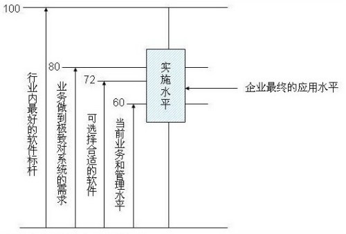 如果用一個數(shù)量化的概念來表達的話,假定行業(yè)內(nèi)最好的軟件是100分,企業(yè)做到極致對系統(tǒng)的需求可能是80分,當然也可能沒有一個軟件能滿足企業(yè)所有的需求,但從整體上,一個企業(yè)的主體需求一定在行業(yè)內(nèi)最好的軟件標桿之下。而當前的業(yè)務和管理水平一般到不了極致,假設是60分,那選擇的軟件70-75分一定是合適的,高于當前需求,而不要高得太多,最終的實施水平是一個區(qū)間,這取決于實施商的能力和企業(yè)的能力,可能會低于企業(yè)當前業(yè)務和管理水平,也可能使系統(tǒng)超水平發(fā)揮,而企業(yè)最終的應用水平一般就在這個區(qū)間里游動了。這個模型看起來很理論化,操作時需要考慮很多的因素,但是非常有價值的判斷標準。