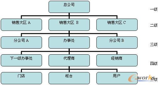 目前國內(nèi)企業(yè)分銷網(wǎng)絡(luò)層次最多可達(dá)到五層,如圖1所示。最上層是營銷總部,第二層是銷售大區(qū),第三層是各地分公司、辦事處,第四層是各地辦事處、代理商和經(jīng)銷商,第五層是用戶或門店。