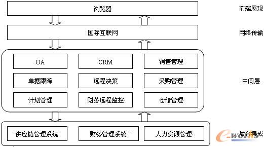 中間層:是實現(xiàn)具體的應(yīng)用功能的層次,包括銷售、采購、倉儲管理、遠(yuǎn)程審批/監(jiān)控/決策等;