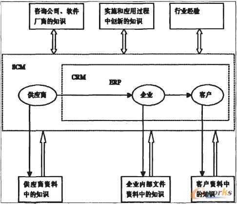 供應鏈上的各個企業(yè)在各自ERP系流運行的基礎上,與客戶之間用CRM系統(tǒng)聯(lián)結起來,而整個供應鏈上的所有企業(yè)都在SCM系統(tǒng)框架之內(nèi)。三者整合過程中,供應鏈上各個企業(yè)(包括上游企業(yè)即供應商,下游企業(yè)即客戶)資料中的知識由各個企業(yè)傳遞到CRM信息管理平臺之上。而咨詢公司與軟件廠商的知識、實施和應用過程中創(chuàng)新的知識以及行業(yè)經(jīng)驗等知識則需要在整合過程中在各個企業(yè)湖軟件廠商之間相互交流、磨合,最后提出大家都比較滿意的方案,付諸實拖。