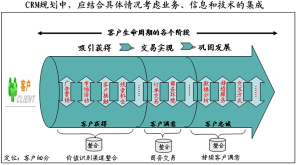 在客戶生命周期的全過程中,企業(yè)通過高效、有序的管理手段和信息技術(shù),識別、吸引獲得、交易實現(xiàn)、鞏固發(fā)展客戶,與其保持終身的互動關(guān)系,并有計劃地滿足其需求。整個過程中有一橫N縱,一橫就是客戶生命周期線,N縱就是企業(yè)與客戶生命周期線的每個直接或間接接觸點。通過這一橫N縱,打造以客戶為中心的360度客戶服務。有的接觸點貫穿客戶整個生命周期。