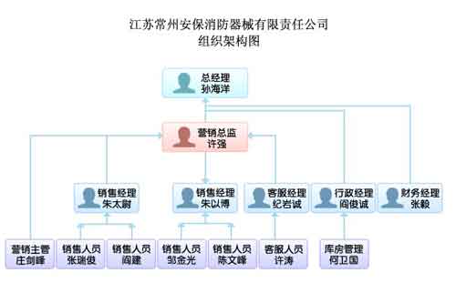 百會(huì)CRM模擬了“江蘇常州安保消防器械有限責(zé)任公司”的組織架構(gòu),設(shè)置了一套專(zhuān)門(mén)針對(duì)產(chǎn)品銷(xiāo)售型、生產(chǎn)制造型企業(yè)的CRM系統(tǒng),對(duì)CRM系統(tǒng)所提供的模塊和不同職位的人員所具備的權(quán)限都進(jìn)行了界定,這樣一套系統(tǒng)就足夠以銷(xiāo)售和生產(chǎn)制造為主的公司進(jìn)行使用。該公司的具體組織架構(gòu)見(jiàn)下圖。