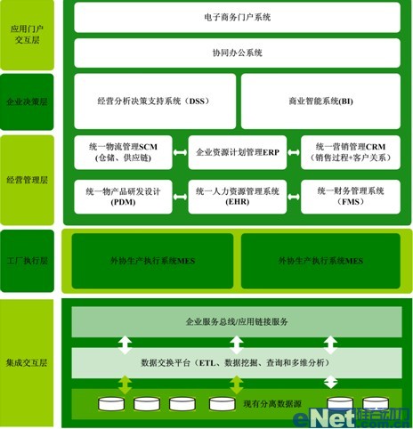 根據(jù)企業(yè)管理發(fā)展戰(zhàn)略及目標(biāo),需要考慮建設(shè)“集成化數(shù)字管控制造系統(tǒng)”,涵蓋企業(yè)決策層、企業(yè)經(jīng)營管理層。根據(jù)整體業(yè)務(wù)模式,企業(yè)經(jīng)營管理層又可以進(jìn)一步分解為公司管理層和工廠執(zhí)行層;從信息化戰(zhàn)略支撐角度可以分解為企業(yè)門戶交互層、應(yīng)用系統(tǒng)層、應(yīng)用集成層和網(wǎng)絡(luò)支撐層。實現(xiàn)企業(yè)信息流、資金流、物流、商物流的高度集成、統(tǒng)一,為企業(yè)生產(chǎn)、經(jīng)營提供強(qiáng)有力的信息化支撐。