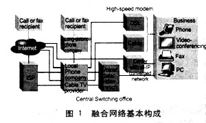 。。在網(wǎng)絡(luò)的不同層次,融合目標(biāo)可以歸納為:傳輸技術(shù)趨向一致,網(wǎng)絡(luò)層面實(shí)現(xiàn)互連互通,業(yè)務(wù)層上互相交叉,應(yīng)用層上趨向使用統(tǒng)一的協(xié)議與應(yīng)用軟件。傳輸通信層和中間網(wǎng)絡(luò)層是融合主要進(jìn)行的層次。圖1為融合網(wǎng)絡(luò)的基本構(gòu)成。