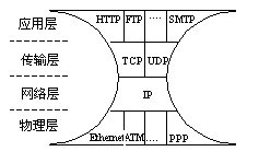 。。IP協(xié)議在多樣的物理介質(zhì)與多樣的應(yīng)用需求之間建立了簡單而統(tǒng)一的映射方法。這樣形成的融合網(wǎng)絡(luò)具有沙漏型的體系結(jié)構(gòu),如圖2所示,可以靈活地進(jìn)行業(yè)務(wù)的配置和物理網(wǎng)絡(luò)的升級(jí)。由于IP技術(shù)在安全性和用戶管理方面的缺陷在三網(wǎng)融合過程當(dāng)中還不構(gòu)成大的障礙,因此基于IP進(jìn)行三網(wǎng)融合幾乎是必然的選擇。