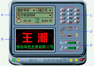 (如圖1)“王潮暢談?wù)Z音全球通”的主界面。A部分是虛擬液晶顯示屏,這里顯示的內(nèi)容與 D(功能鍵區(qū))相對應(yīng),B是廣告位,如果有興趣可以與王潮公司聯(lián)系作廣告(^_^),C是撥號區(qū),D是功能按鈕區(qū),集中了這個軟件的主要功能,E是音量調(diào)節(jié)區(qū)。整個界面簡潔合理。