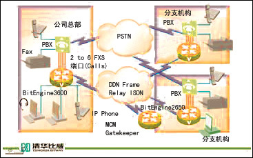 利用清華比威BitEngine系列路由器產(chǎn)品提供的VoIP(Voice over IP)支持,以及該產(chǎn)品具有的安全、加密、QoS、路由等特性,通過將長(zhǎng)話旁路到數(shù)據(jù)網(wǎng)上,為企業(yè)節(jié)省大量的長(zhǎng)話費(fèi)用開銷,同時(shí)利用豐富的接口,同原有的交換機(jī)相連,有效保護(hù)了企業(yè)原先的投資繼續(xù)有效。本方案中,使用清華比威的BitEngine2650/3600路由器實(shí)現(xiàn)企業(yè)間數(shù)據(jù)業(yè)務(wù)和語(yǔ)音業(yè)務(wù)的融合,BitEngine系列路由器提供了完善的QoS保證機(jī)制(支持PQ/WFQ/CBWFQ/WRED等多種隊(duì)列方式),確保語(yǔ)音數(shù)據(jù)的優(yōu)先處理。