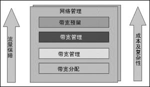 如圖所示,網(wǎng)絡(luò)管理貫穿于四個模塊建立過程中。特定的組件應針對網(wǎng)絡(luò)基礎(chǔ)設(shè)施的特定部分而實施。具體實施時,應首先從帶寬分配模塊開始,然后逐個上移。實施的模塊越多,保證的品質(zhì)會越高,但同時也增加了管理的復雜性,加大了維護成本。