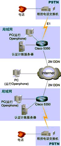 組成這個IP電話的網(wǎng)絡(luò)系統(tǒng)由處于兩個不同國家的區(qū)域組成(見附圖1網(wǎng)絡(luò)拓?fù)浣Y(jié)構(gòu)),每個區(qū)域都采用了一臺Cisco 5350路由器(以下簡稱5350)作為網(wǎng)絡(luò)的核心,這臺5350路由器具有兩個WAN口和兩個以太網(wǎng)口,能夠直接連接到本地的局域網(wǎng)和DDN基帶調(diào)制解調(diào)器。和普通電話網(wǎng)絡(luò)(PSTN)相連接則是通過添加一個E1接口卡4PRI和一個IP語音數(shù)據(jù)處理單元NP60,來實現(xiàn)E1(30條ISDN的B信道)和路由器相連接,實時地對語音數(shù)據(jù)進(jìn)行H.323壓縮編碼。