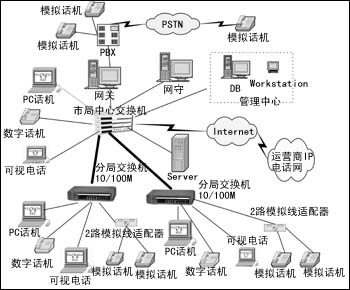 首信的IP-PBX解決方案如圖所示。以某局為例,市局與各分局之間已有寬帶網(wǎng),充分利用此帶寬以數(shù)字電話形式開展語音業(yè)務(wù)。數(shù)字電話的實現(xiàn)形式有:PC話機、數(shù)字話機、可視電話、通過模擬線適配器接入的模擬話機,數(shù)字電話設(shè)備直接通過Hub與以太網(wǎng)交換機相連。數(shù)字電話通過IP電話網(wǎng)關(guān)與市局中心的程控交換機PBX相連,從而與現(xiàn)有的模擬話機相通。各種數(shù)字話機與內(nèi)部模擬話機間通話,都不需要付電話費,通過PBX撥打局外面的市話或長途電話時,與原來的模擬電話一樣付費。