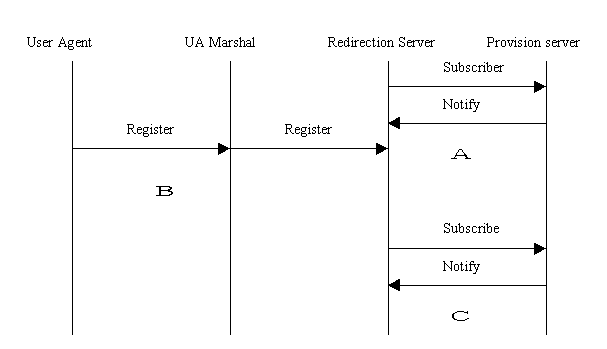 1> 在A階段當啟動Redirection Server(RS)的時候,RS向Provisioning Server(PS)發(fā)送SubScribe消息,取得合法的用戶列表;