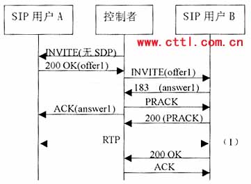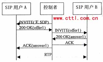 控制者再向B發(fā)送一個(gè)沒有SDP的INVITE。B應(yīng)答的200 0K響應(yīng)中包含一個(gè)提供offer2,控制者應(yīng)該基于offer2向A發(fā)送一個(gè)re-INVITE,注意。offer2可能需要稍作修改來滿足媒體要求。例如如果offer1包含一個(gè)音頻和一個(gè)視頻行,而offer2只有一個(gè)音頻行,控制者就需要在offer2中增加一個(gè)視頻行(端口設(shè)為O)來構(gòu)成offer2’。由于這是一個(gè)re-INVITE,所以通常應(yīng)該能立即收到響應(yīng)。A的200