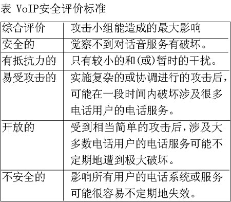 測(cè)試結(jié)果表明,采用了復(fù)雜攻擊手段的攻擊小組無(wú)法破壞思科公司的VoIP網(wǎng)絡(luò),甚至無(wú)法對(duì)其造成顯著的干擾。這套精心制造的IP電話(huà)系統(tǒng)(包括第二層和第三層基礎(chǔ)設(shè)施以及各式各樣的附加安全軟件)是“安全的”(參見(jiàn)表中所示的VoIP安全評(píng)價(jià)標(biāo)準(zhǔn)),它最大限度地全面發(fā)揮了思科公司的網(wǎng)絡(luò)安全專(zhuān)長(zhǎng),利用了思科公司擁有的每一種防御武器。