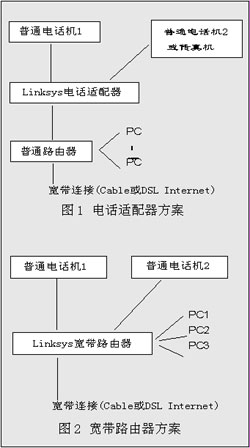 利用電話適配器和寬帶路由器實(shí)現(xiàn)VoIP服務(wù)提供以及與PC的連接,分別如圖1和圖2所示。