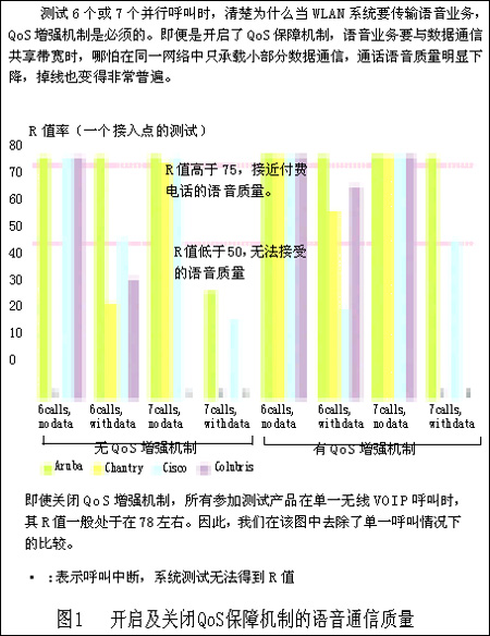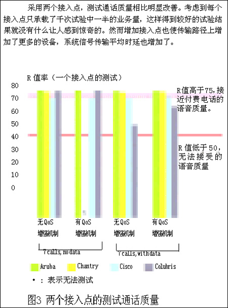 而其他供應(yīng)商的設(shè)備在開啟QoS保障機(jī)制的情況下,一旦加入數(shù)據(jù)流業(yè)務(wù),就很難保證通話質(zhì)量。從正面來(lái)看,在只有語(yǔ)音傳輸業(yè)務(wù)的情況下,QoS保障機(jī)制一般運(yùn)行較好。當(dāng)我們只承載語(yǔ)音傳輸時(shí),所有系統(tǒng)的音頻質(zhì)量都改善了。在不加入數(shù)據(jù)流情況下測(cè)試6個(gè)或7個(gè)并行VoIP呼叫,所有的系統(tǒng)都能夠取得和付費(fèi)電話一樣的通話質(zhì)量。但當(dāng)我們加入數(shù)據(jù)流業(yè)務(wù),一切都改變了。在承載6個(gè)并行VoIP呼叫并加入數(shù)據(jù)流業(yè)務(wù)的情況下,Colubris CN1250系統(tǒng)的R值衰落到70以下。根據(jù)ITU的R值標(biāo)準(zhǔn),這說(shuō)明一些用戶的通話質(zhì)量不令人滿意。Chanrty的R值在60左右,這個(gè)結(jié)果將不能令用戶滿意。除了客觀的R值評(píng)分以外,我們還進(jìn)行了一些主觀的通信質(zhì)量監(jiān)聽,當(dāng)加入了數(shù)據(jù)流業(yè)務(wù)以后,我們聽到了大量的回聲,掉線頻繁?傊,只要測(cè)試點(diǎn)加入數(shù)據(jù)業(yè)務(wù)流,上面描述的情況就會(huì)出現(xiàn),通話質(zhì)量通常變得惡劣。
