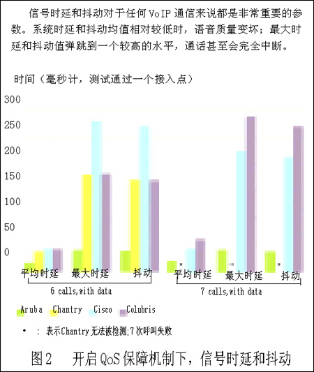 上述操作是為了啟動(dòng)QoS保障機(jī)制后,系統(tǒng)就能取得顯著的成效。但只有Aruba的系統(tǒng)在所有測(cè)試中保持了一貫的良好表現(xiàn),在具有QoS保障機(jī)制的情況下,甚至在最惡劣的情況下(7個(gè)并行VoIP呼叫并加入數(shù)據(jù)流業(yè)務(wù)),它仍然能夠傳送出和付費(fèi)電話通話質(zhì)量一樣的信號(hào)。Aruba的系統(tǒng)在打開QoS增強(qiáng)機(jī)制的情況下,系統(tǒng)承載業(yè)務(wù)最空閑和最繁忙的測(cè)試結(jié)果差別很小。
