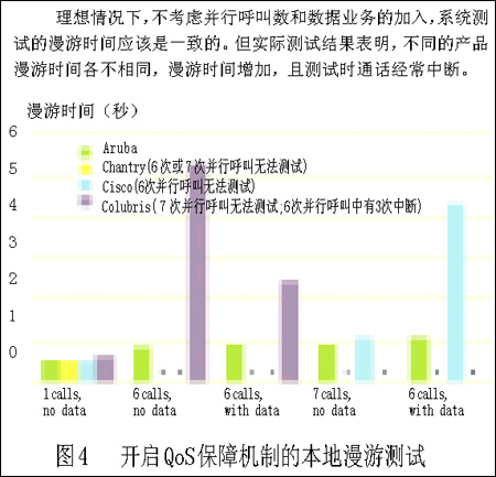 但我們這樣做是合理的。首先,Chantry和Colubris的設(shè)備甚至在建議內(nèi)的6個(gè)并行VoIP呼叫情況下,也無(wú)法正常通話。第二,Aruba的設(shè)備能夠處理7個(gè)并行VoIP呼叫并能適應(yīng)加入數(shù)據(jù)流業(yè)務(wù)的情況。第三,我們最有難度的試驗(yàn)也遠(yuǎn)低于無(wú)線傳輸媒介的最大負(fù)載。我們?cè)囼?yàn)通常低于3Mbps的通信傳輸速度(包括試驗(yàn)中的所有語(yǔ)音和數(shù)據(jù)業(yè)務(wù)),更遠(yuǎn)低于無(wú)線信道的容量了?傊,VoWLAN系統(tǒng)可以實(shí)現(xiàn)在單接入點(diǎn)承載7個(gè)并行VoIP呼叫并加入數(shù)據(jù)通信業(yè)務(wù),但要做到這一點(diǎn)需要更完善的系統(tǒng)設(shè)計(jì)和產(chǎn)品性能。
