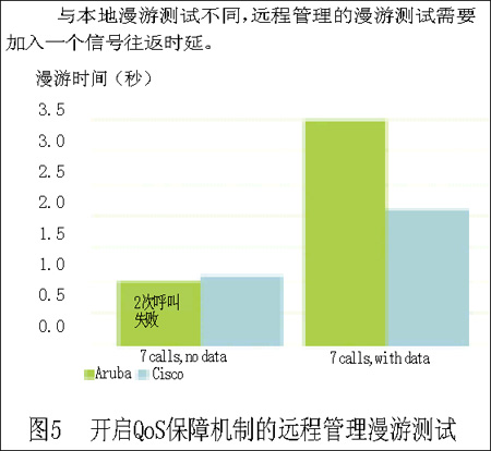 Aruba公司的設(shè)備在漫游測(cè)試中表現(xiàn)出色,它的平均漫游切換時(shí)間在0.5~1秒之間,雖然這已經(jīng)是所有的測(cè)試設(shè)備中表現(xiàn)最好的,但是通話者還是能夠察覺(jué)這種時(shí)延。而Cisco公司的設(shè)備,由于時(shí)間的限制,我們只進(jìn)行了7個(gè)并行呼叫的漫游測(cè)試,平均漫游時(shí)間為0.433秒到1.053秒,而加入數(shù)據(jù)流業(yè)務(wù)時(shí),在7個(gè)并行VoIP呼叫時(shí),系統(tǒng)的時(shí)延達(dá)到了4.324秒。