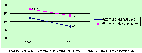 IP電話使ARPU值降低。2003年和2004年全國(guó)電信業(yè)務(wù)收入及電話用戶總數(shù)分別為4610億元、53199.8萬(wàn)戶和5205億元、64726.7萬(wàn)戶,平均ARPU值2003年為72.2元,2004年為67元。通過(guò)分析計(jì)算,由于IP電話造成的業(yè)務(wù)收入流失使2003年的平均ARPU值降低了5.3元,