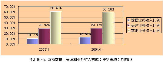 目前數(shù)據(jù)業(yè)務(wù)收入與話音業(yè)務(wù)收入相差懸殊,通過(guò)發(fā)展數(shù)據(jù)業(yè)務(wù)彌補(bǔ)VoIP造成的話音收入損失尚需時(shí)日。以固網(wǎng)運(yùn)營(yíng)商為例,2003年和2004年數(shù)據(jù)業(yè)務(wù)、長(zhǎng)途業(yè)務(wù)和本地業(yè)務(wù)收入構(gòu)成見圖2所示。