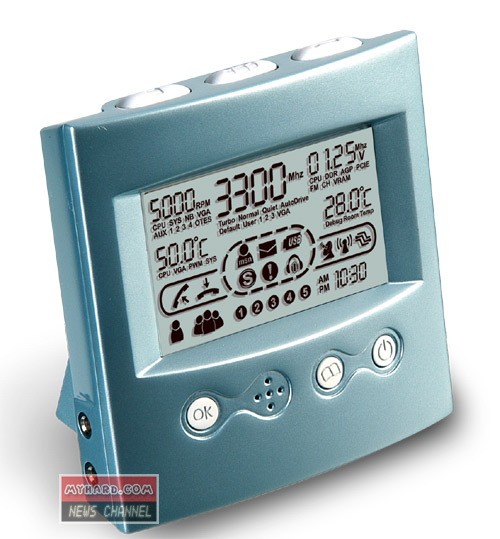 這個(gè)裝置,其實(shí)是一項(xiàng)早期工具的衍生產(chǎn)品。早在2004年,這個(gè)具有獨(dú)立顯示屏的小東西被開發(fā)出來,用以控制電腦的超頻設(shè)定并監(jiān)控系統(tǒng)的效能。現(xiàn)在這個(gè)在下周起于各大通路都買得到的新機(jī)種已納入Skype話務(wù)管理功能,使用者可直接把頭戴式耳機(jī)接到這個(gè)小時(shí)鐘上,one-touch輕輕一按,便可立即進(jìn)行接通電話、速簡撥號(hào)及電話會(huì)議。