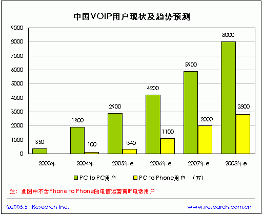 中國VOIP市場上PC to PC的VOIP電話主要是通過即時通訊軟件和語音聊天室來實(shí)現(xiàn)的,目前這部分服務(wù)絕大多數(shù)是免費(fèi)的,尚未給服務(wù)公司帶來直接的經(jīng)濟(jì)收入。根據(jù)iResearch的統(tǒng)計數(shù)據(jù),2004年中國PC to PC的VOIP電話用戶達(dá)到1900萬,2005年有望達(dá)到2900萬。由于信息產(chǎn)業(yè)部在2003年2月發(fā)布的《電信業(yè)務(wù)分類目錄》中規(guī)定IP電話屬于第一類基礎(chǔ)電信業(yè)務(wù),但“IP電話業(yè)務(wù)在此特指由電話網(wǎng)絡(luò)和IP網(wǎng)絡(luò)共同提供的Phone-Phone以及PC-Phone的電話業(yè)務(wù)”,這與目前虛擬運(yùn)營的Phone to Phone 、PC to Phone的寬帶電話略有不同,盡管如此這一規(guī)定對提供Phone to Phone 和PC to Phone的非電信運(yùn)營商有著非常大的制約,目前在我國提供“到電話”的VOIP服務(wù)除部分基礎(chǔ)電信運(yùn)營商試驗(yàn)外多為暗中操作,存在較大的風(fēng)險不能通過大規(guī)模的市場推廣來迅速吸引用戶,因此PC to Phone的VOIP電話用戶增長速度將相對平穩(wěn),據(jù)iResearch預(yù)測,2008年中國的PC to Phone的VOIP電話用戶將達(dá)到2800萬戶。