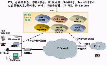 該公司的IP媒體服務(wù)器 (IP Media Server SDK)是一個具有IP多媒體處理能力和SIP呼叫功能的開放平臺。它主要提供給各增值業(yè)務(wù)開發(fā)商、軟交換廠商、軟件開發(fā)商以及具有開發(fā)能力的系統(tǒng)集成商。基于該平臺,這些廠商可以迅速地、低成本地開發(fā)出各種各樣的基于IP的增值業(yè)務(wù)如下圖所示:
