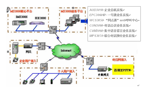 MS3000基于NGN交換技術(shù),在以軟交換技術(shù)為基礎(chǔ)的呼叫控制中心平臺上提供獨(dú)立的、多種形式的電信增值業(yè)務(wù)。