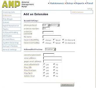 設(shè)置好中繼后,現(xiàn)在AAH就與你的VoIP服務(wù)提供商建立好連接了,接下來就是使用“Add an Extension”頁面(圖5)來設(shè)置你的電話了,每一個(gè)Extensions選項(xiàng)必需指定一個(gè)名字、數(shù)字和密碼,還可隨意給它指定一個(gè)語音信箱的目錄。
