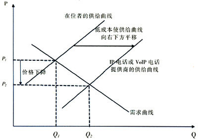 與傳統(tǒng)以電路交換為主的電話網(wǎng)相比,分組交換技術(shù)使得提供IP電話或VoIP電話所需的交換設(shè)備數(shù)量大大減少,而且部分提供IP電話或VoIP電話的運(yùn)營(yíng)商并沒(méi)有鋪設(shè)上下行用戶端的“最后一公里”線路。由于沒(méi)有全程布網(wǎng),在網(wǎng)間結(jié)算費(fèi)較低甚至不結(jié)算的情況下,其運(yùn)營(yíng)成本自然遠(yuǎn)低于本地運(yùn)營(yíng)商,從而使其供給曲線與本地運(yùn)營(yíng)商的供給曲線相比向右下方偏移,因而有能力推出價(jià)格遠(yuǎn)低于傳統(tǒng)語(yǔ)音的IP電話或VoIP電話,見(jiàn)圖2。