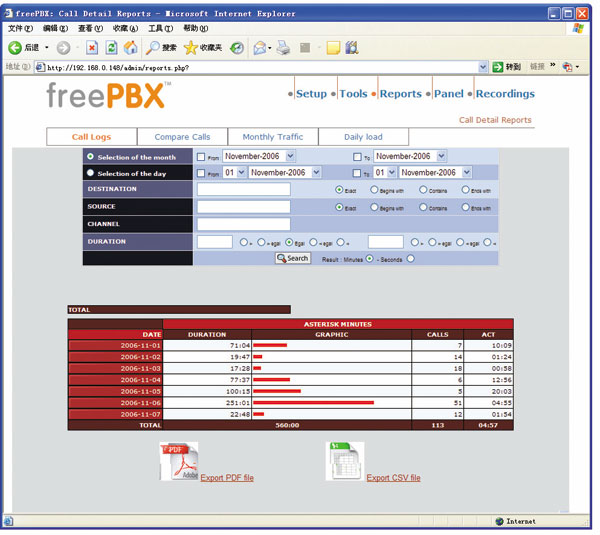 使用Trixbox的統(tǒng)計報告功能(如圖5所示),用戶能夠察看在一個時間段內(nèi)的通話統(tǒng)計數(shù)據(jù),例如呼叫建立總數(shù)、呼叫平均時長、失敗呼叫比例等等,當然也能夠察看每個呼叫的主叫/被叫號碼,以及呼叫發(fā)生的具體時間。